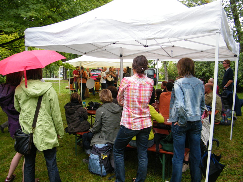 Und auch wenn´s ein wenig tröpfelt, die Ziegenklopfer-Show will niemand verpassen - also alle ab unter die Zelte oder die Schirme...