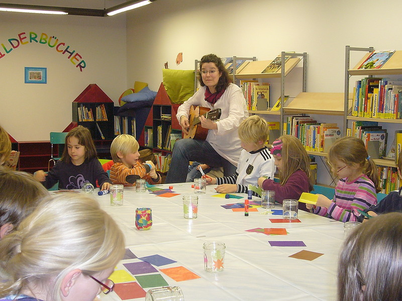 Frau Haltrich und ihre Gitarre geleiten die Zuhörer durch die Geschichte, zwischendurch singen alle zusammen Weihnachtslieder zur Einstimmung auf...